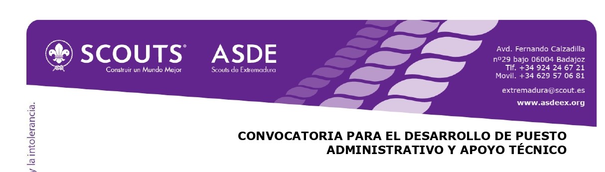 ASDE-SCOUTS de Extremadura nos traslada información de una Oferta de Empleo para puesto de ADMINISTRATIVO Y APOYO TÉCNICO.