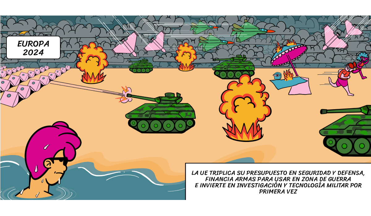 El informe advierte del aumento en gasto militar de los países del continente europeo, que ya se sitúa el segundo en el ranking mundial de gastos militares, solo detrás de EEUU y por delante de China. Analiza también las consecuencias de decisiones políticas como el hecho de que por primera vez el presupuesto europeo se destine a la investigación y el desarrollo de armamento militar de alta tecnología, una actividad hace poco prohibida por la propia UE, y de que las empresas de armas europeas sean el segundo sector económico que más crece, solo por detrás del de la inteligencia artificial.
