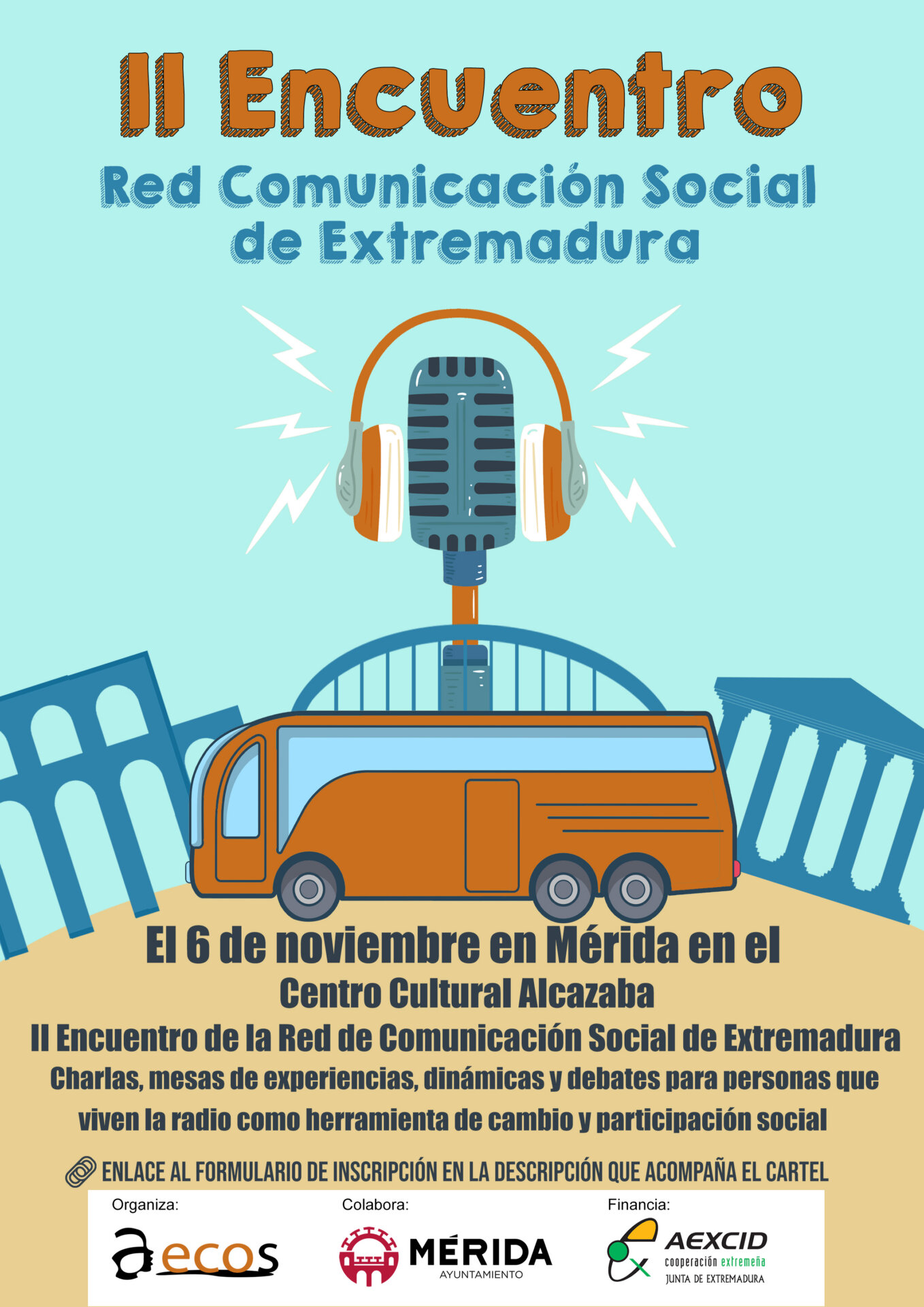 Desde AECOS nos invitan al II Encuentro de la Red de Comunicación Social de Extremadura. El próximo sábado 6 de noviembre tendremos la oportunidad de vivir la Radio como herramienta de intervención Social. Será en el Centro Cultural Alcazaba de Mérida.