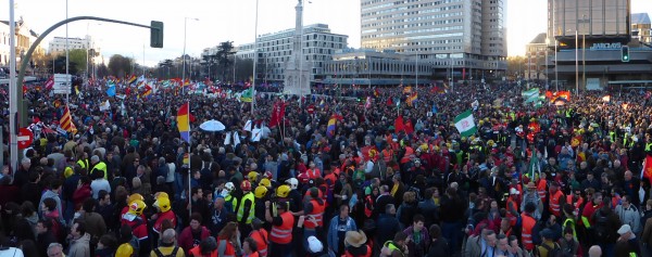 “Esta marcha es el deseo de recuperar la dignidad a través de un esfuerzo individual y colectivo”, acertaba a decir Alfredo Soler, conteniendo las lágrimas al poco de pisar las calles de Madrid. Para este médico de la localidad asturiana de Luarca era el final de 22 días caminando en las marchas de la dignidad. “Llego a Madrid cargado de emoción y de rabia. Hoy no conseguiremos nada, pero podremos ganarlo todo a partir de hoy”, comentaba.Quizás desde la convocatoria de las mareas ciudadanas, hace ya más de un año, Madrid no vivía una jornada de protesta que transmitiera euforia de forma tan multitudinaria. La llegada de los caminantes, bajo el directo lema de “Pan, techo y trabajo”, propuesto en el manifiesto de la convocatoria, impulsó que los “centenares” o “pocos miles” que habían protagonizado las últimas protestas contra las medidas del Gobierno de Rajoy, se contaran nuevamente por “cientos de miles”.Más allá de las cifras, dos millones llegaron a asegurar de la organización, Madrid vivió una de esas tardes en las que se siente con nitidez el hartazgo y las ganas de cambio una multitud de personas, pertenecientes a toda clase de colectivos. A las seis de la tarde, un río de manifestantes llegaba desde Atocha hasta Colón, rebosando una amplia avenida de alrededor de 2 kilómetros y medio.