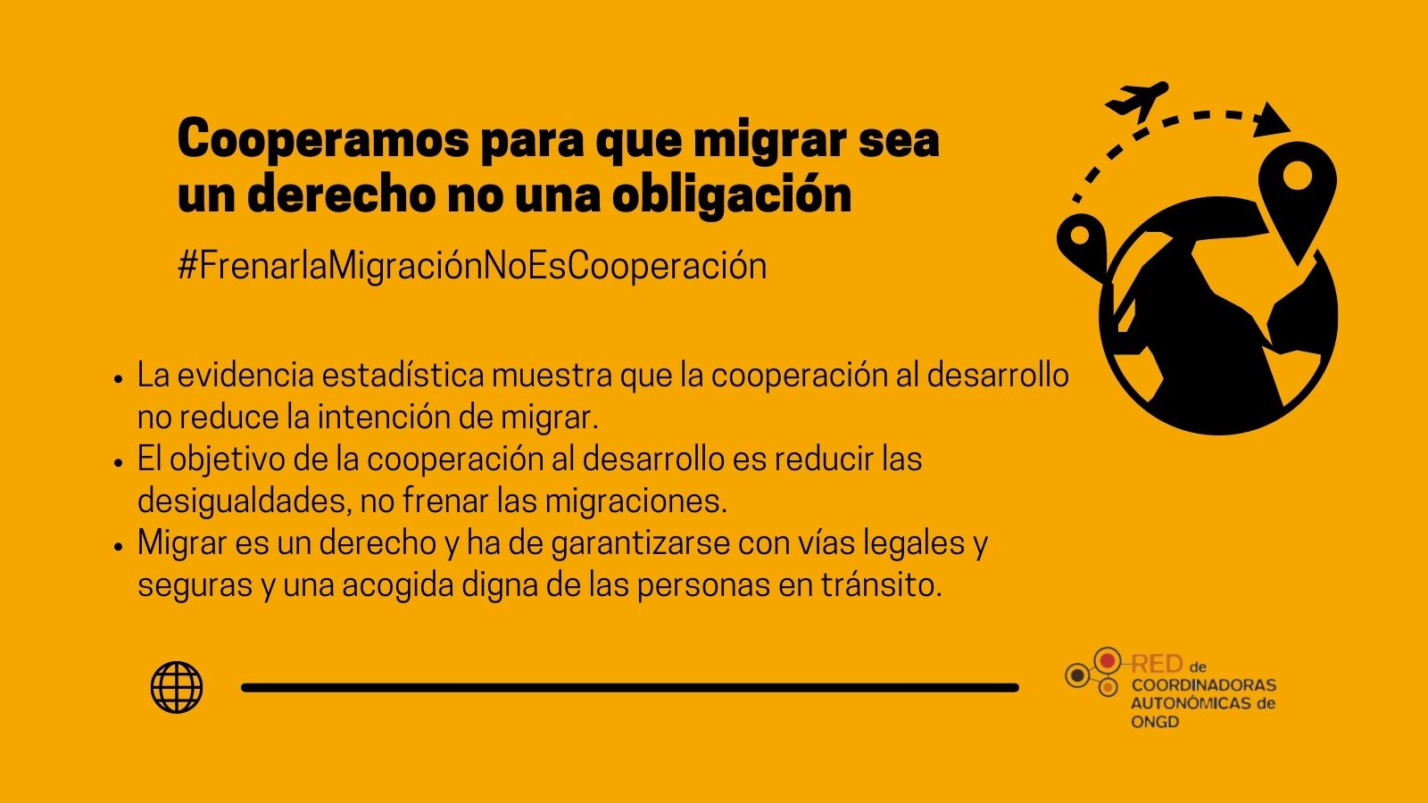 La relación principal de la cooperación para el desarrollo con las migraciones ha de ser promover contextos de vida favorable para que las personas no se vean obligadas a migrar. En ningún caso, la cooperación debe ser utilizada como una herramienta para frenar la migración o como un instrumento de externalización de fronteras.